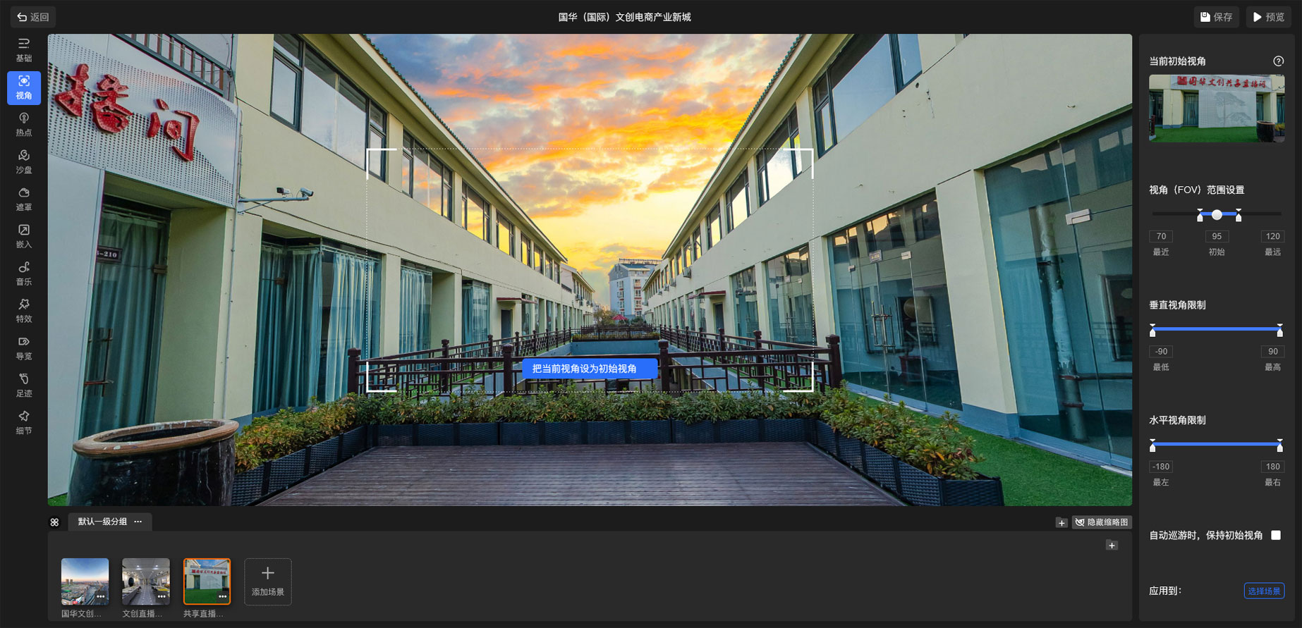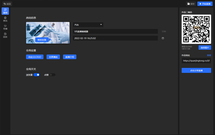 支持全景视频编辑,设置自定义LOGO、设置作品访问密码、设置视角等